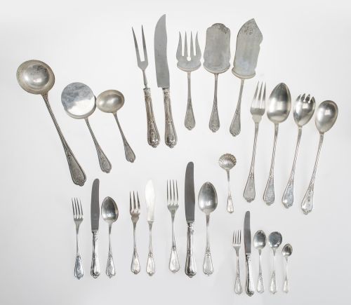 Compuesta por: 24 tenedores, 12 cuchillos y 11 cucharas de mesa; 12 tenedores y 12 palas de pescado y un juego de servir; 12 tenedores, 12 cuchillos y 12 cucharas de lunch; 12 tenedores, 12 cuchillos y 12 cucharillas de postre; 12 cucharillas de helado y una pala para postres; 12 cucharillas de café y una para azucarero en forma de venera, una pala para servir huevos, un cazo para salsa, un juego de servir carne y otro para legumbres; un cazo para sopa; un juego de trinchar.