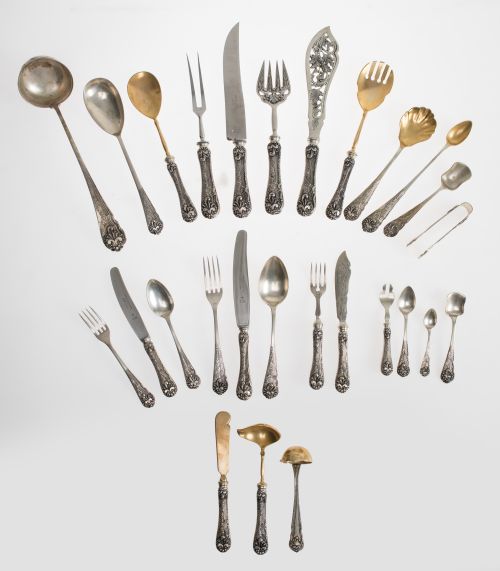 Consta de 12 tenedores de mesa, 12 cucharas de mesa, 12 cuchillos de mesa, 12 tenedores de pescado, 12 palas de pescado, 12 tenedores de postre, 12 cucharas de postre, 12 cuchillos de postre, 12 pinzas para espárragos, 12 tenedores de marisco, 12 cucharillas de té, 12 cucharillas de café y 15 cubiertos de servir.