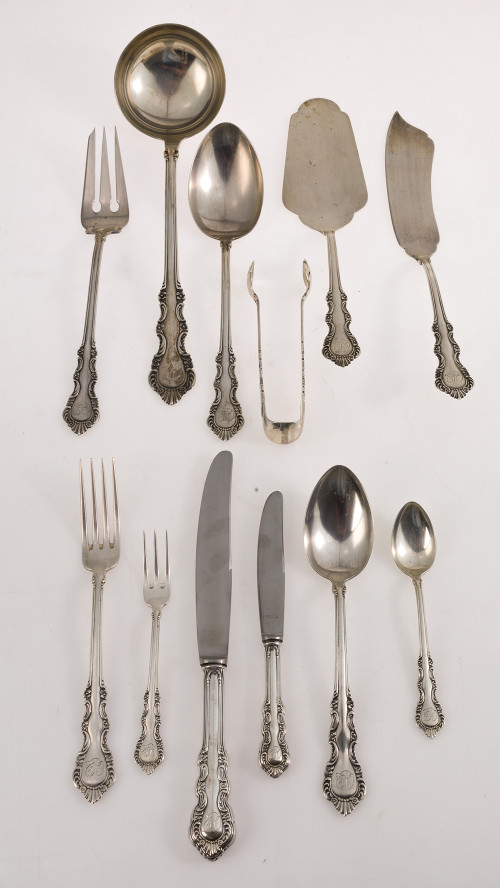 Cubertería en plata española ley 916. Mangos con decoración de rocalla, motivos florales e inicales grabadas. 12 tenedores, 12 cuchillos, 12 cucharas de mesa, 12 cucharillas, 12 cuchillos de postre y 6 cubiertos de servir. Peso total sin cuchillos. 3 090 gr.