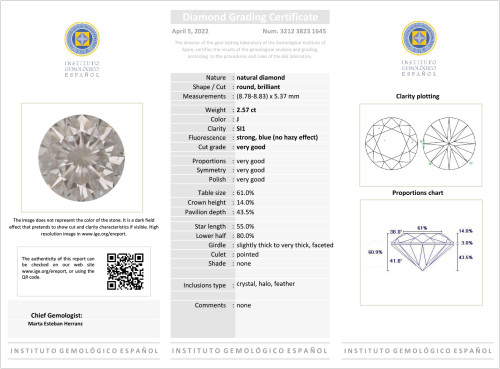 Diamante, talla brillante, de 2.57 ct. Color J, Pureza SI1. Se acompaña de certificado I.G.E. Nº 321238231645.