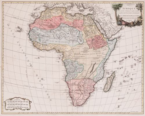 Título, autor, privilegio y año, en cartela grabada por Gobin: figura femenina recostada entre palmeras, león y elefante.