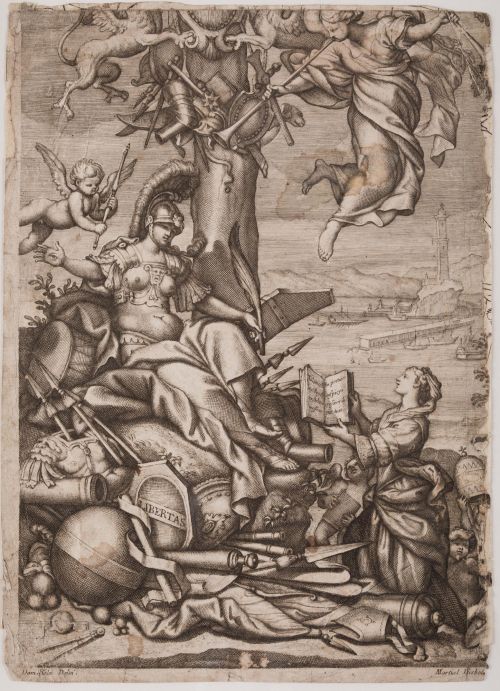 Diseño de Piola y grabado por Martial Desbois (1630-1700). Deterioros y recortado en su parte superior. El dibujo preparatorio para el grabado se conserva en la Royal Collection Trust (RCIN 903766)