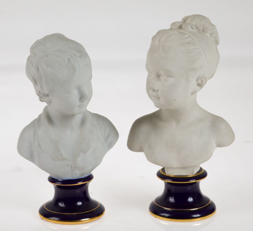 Lote de dos bustos de biscuit francés S.XX, representando unas cabezas de niños. Bases vidriadas en azul cobalto. Marcas de Sevres y de Limoges, respectivamente.