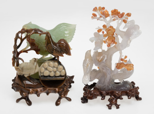 Dos grupos de onix verde y ágata carneola cornalina, China, S. XX. Ambos representando aves sobre ramas.