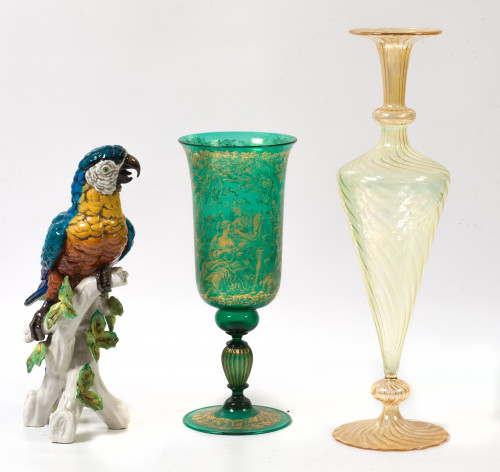 Dos jarrones de cristal soplado, S. XX. Uno de cristal irisado de tono dorado y otro de cristal verde con decoración dorada.