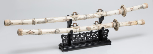Dos katanas de hueso tallado, grabado y entintado, Japón, med. S. XX.