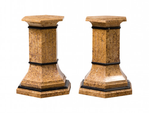 Dos pies de mármol brocatel y mármol negro, S. XX. De base hexagonal y fuste acanalado.