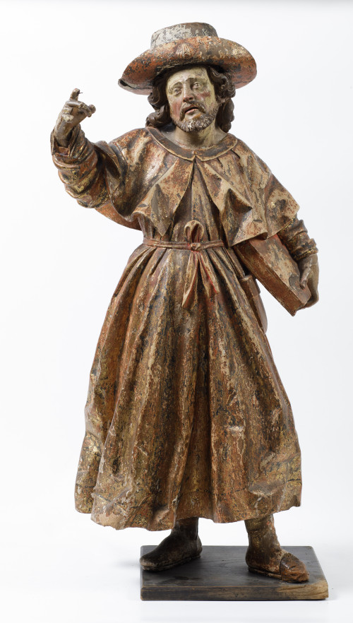De madera tallada y policromada. Sobre base posterior. Faltas y pérdidas de policromía.