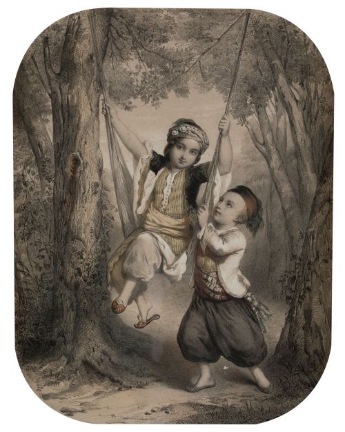 "Niños con atuendos turcos en columpio"