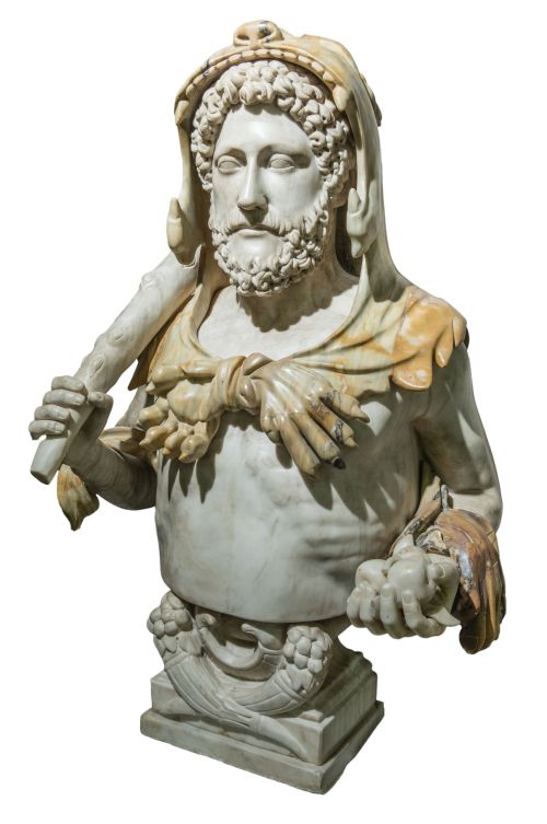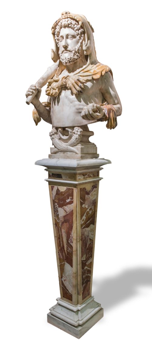 Esta imponente escultura, realizada por talleres italianos en el siglo XIX, se inspira en un modelo de época que se conserva en los Museos Capitolinos de Roma y que representa al emperador Lucio Aurelio Cómodo; último de la dinastía Antonina, hijo de Marco Aurelio y Faustina la Menor. Este modelo está considerado como una de las grandes obras maestras de la retratística romana y muestra al emperador caracterizado como el semidiós Hércules, portando algunos de los símbolos de sus principales trabajos: la piel del león de Nemea sobre la cabeza, la clava en la mano derecha y las manzanas de oro robadas en el Jardín de las Hespérides. El busto descansa sobre una pareja de cornucopias o cuernos de la abundancia entrelazados y todo ello sobre una peana en forma de estípite realizada en mármol blanco de carrara y de color veteado. Su ejecución, como señaló Giancarlo Sestieri en un informe redactado en 1998, es extraordinaria, tal y como puede apreciarse en el tratamiento pormenorizado de los cabellos o las facciones del rostro; logrando un hermoso efecto al aplicar un tipo de mármol de tono amarillo para la ejecución de la piel del león.