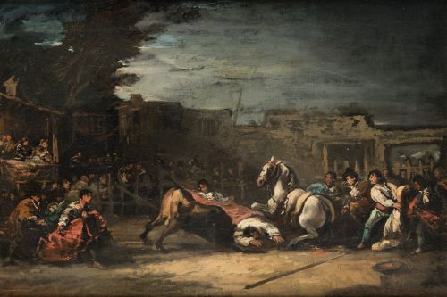 Esta interesante pintura refleja la admiración de Eugenio Lucas por la obra de Francisco de Goya y su afición al mundo de la tauromaquia. Resuelta con su técnica habitual de trazo enérgico y factura abocetada, algunos modelos se inspiran directamente en repertorios conocidos del pintor aragonés.