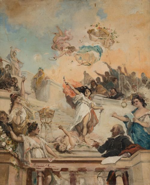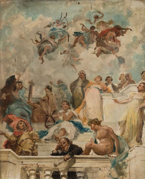 Ejemplos de la labor decorativa desarrollada por el pintor en este espacio son esta pareja de lienzos de tema alegórico que destacan por su pincelada suelta y abocetada y su rico y vivo cromatismo. El primero se corresponde con el que decora la sala de música, apareciendo en él algunos de los compositores predilectos de la familia como Verdi, Chopin, Rossini, Beethoven, Mozart, o Liszt. En segundo, ejecutado para el gabinete de la comedia, figuran poetas, novelistas y dramaturgos de diferentes épocas, encabezados por Lope de Vega.