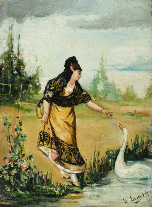 “Dama elegante dando de comer a un cisne"