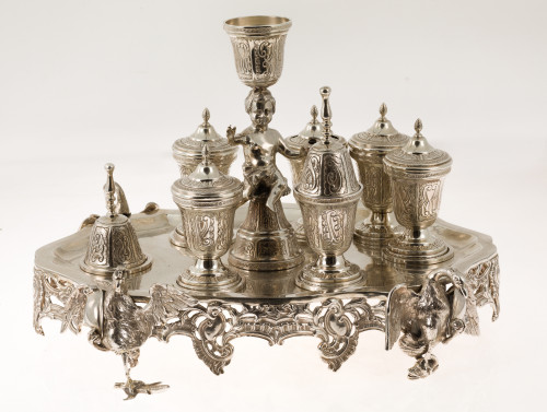 Importante escribanía en plata sterling, ley 925. Base con decoración calada de rocalla. con cuatro figuras de aves, en alto relieve. Figura central de amorcillo , en bulto redondo y recipientes con volutas y tornapuntas. Medidas: 35 x 40 x 35 cm. Peso: 4.750 gr.