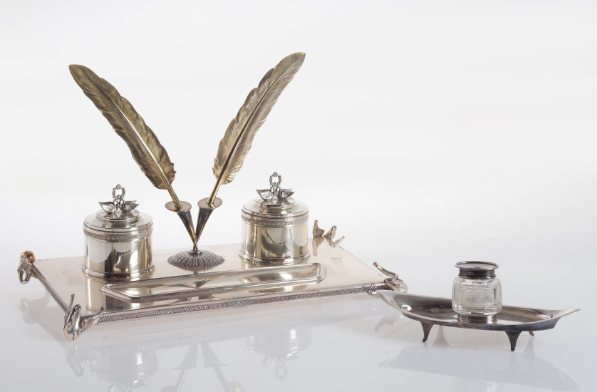 Escribanía en plata española ley 916, estilo Imperio. Base rectangular y pies en forma de cisne (necesitan repaso). Peso total: 1.370 gr.
