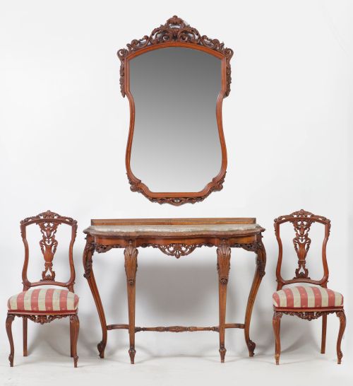De madera tallada y teñida de perfil sinuoso y luna biselada. Precisa repaso.