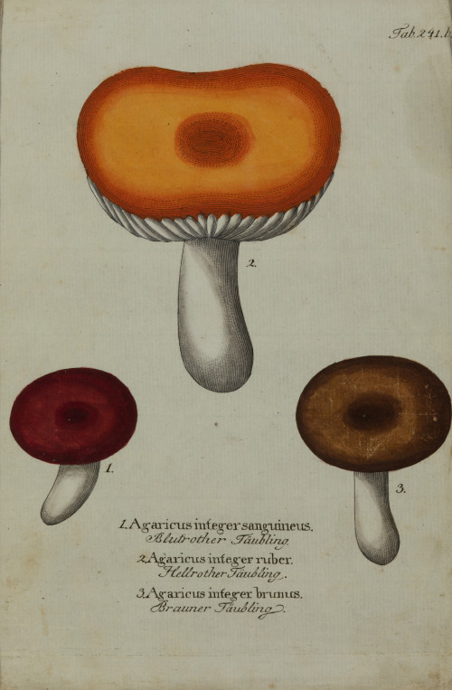 - Agaricus integer sanguineus, Ruber, Brunus. (sanguíneo, rojo, marrón).