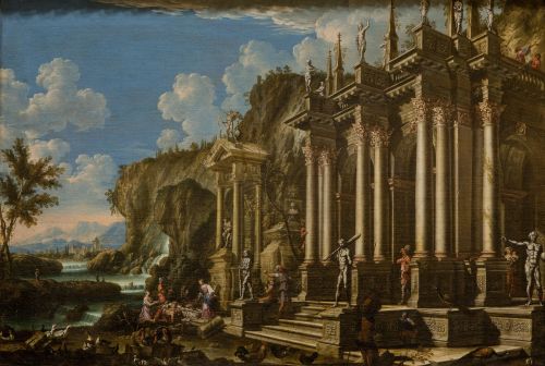 La presente obra reúne todos los elementos característicos del estilo maduro del pintor, hacia 1710, comparable con la conservada en el Museo Civico de Vicenza (91 x 134,5 cm, óleo sobre lienzo, nº inventario A64). Entre ellos la presidencia de una escenografía arquitectónica muy potente, de marcada perspectiva, plagada de estatuas clásica como la de Hércules, que da paso a un paisaje más bucólico y naturalista, rematado en tonos fríos para aumentar la sensación profundidad del paisaje. Además, toda la obra esta animada con animales y figuras en diferentes poses y actitudes, destacando un pequeño grupo en la parte izquierda, que llora a un cadáver que va a ser arrojado al rio. Este grupo, vigilado por una estatua de Crono en lo alto, convierte la obra en una alegoría del paso del tiempo, una vanitas en definitiva. Esto queda confirmado por un grabado de Ambrogio Orio (1737 - 1825) que representa esta obra, o una versión muy similar, ya que hay ligeras variantes en las figuras, que tiene la siguiente inscripción: “Vanitati pur di queste Opre famose,/Umano igegno; ma l´orgaglio abbassa/ Al sol pensier, che te co le tue cose/Il tempo struggitor urta e fracassa”.