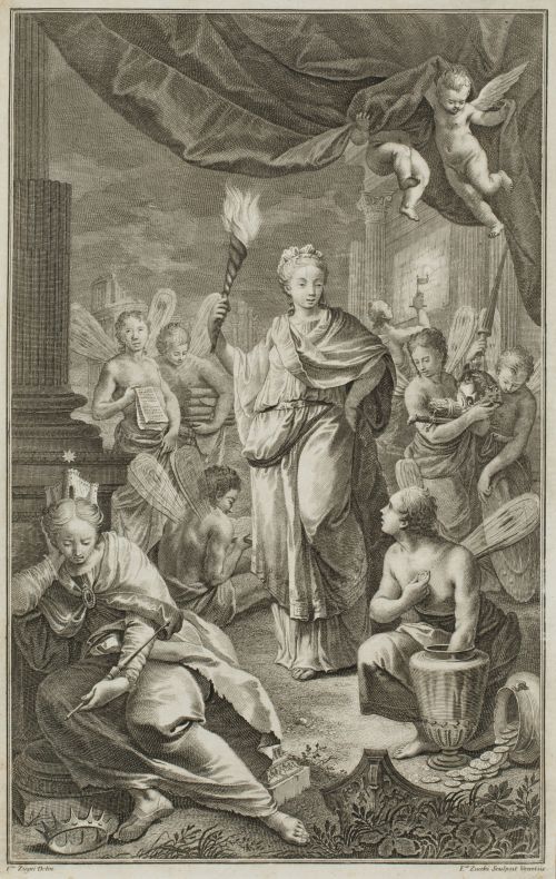 Según la composición original de Francesco Zugno (Venecia, 1709-1787) que sirvió para ilustrar el frontispicio de la obra literaria de Ludovico Antonio Muratori: "Antiquitates Italicae Medii Aevi".