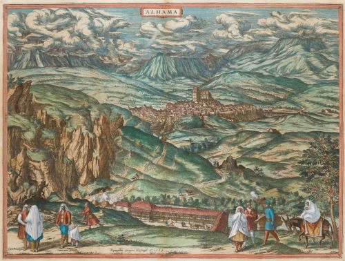 Vista de la ciudad, en la Sierra de Tejeda, sobre el río Alhama, con su muralla y baños romanos. Firma y fecha en plancha: Hoefnagle aº 1564. Reverso en latín.