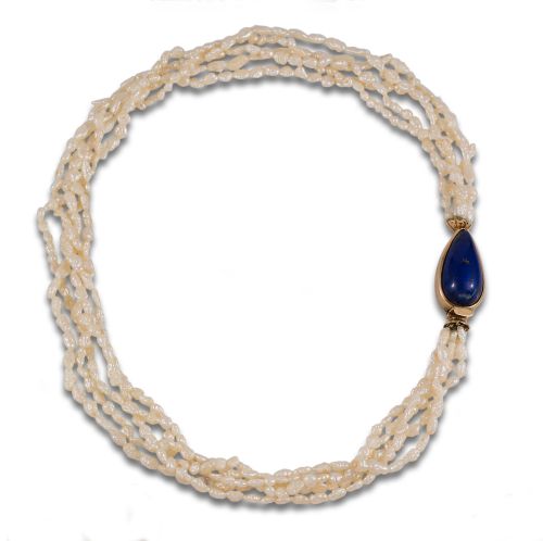 Gargantilla de cuatro hilos de perlitas de río con broche en oro amarillo de 18 kt. y cabujón de lapislázuli.