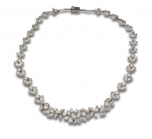 Gargantilla en oro de 18 kt. con motivos vegetales cuajados de diamantes, talla brillante y marquise, con un peso total estimado de 9 ct.