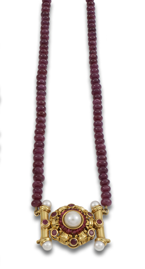 Gargantilla ZANCAN de cuentas de rubí y oro amarillo de 18 kt. con rosetón central de líneas entrelazadas con chatones de rubíes y perlas cultivadas calibradas entre 5 y 9 mm.