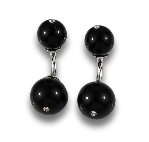 Gemelos dobles de oro blanco de 18 kt. Formados por cuentas de ónix calibradas en 10 y 8 mm. de diámetro con detalle central de diamante, talla brillante.