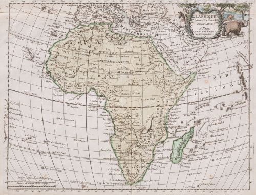 Cartela para título, autor y año, en paisaje con jinete y tres elefantes. Dos escalas en leguas. Color a mano.