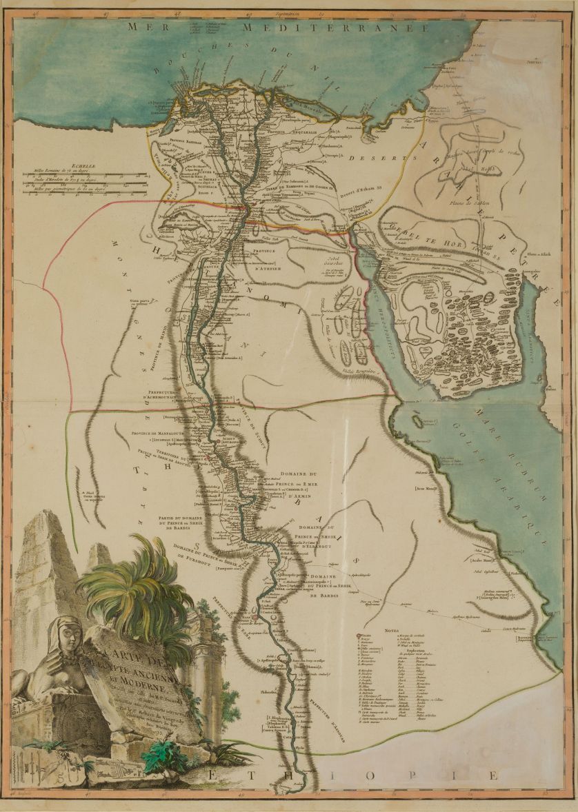 Título, autores, privilegio y fecha en losa junto a la gran esfinge, pirámides de Guiza y otros restos arqueológicos. Abundante toponimia en torno al Nilo. Sitúa el Laberinto, aún no encontrado, junto al lago Moeris y marca la ruta de las caravanas de Berenice, en el Mar Rojo.
