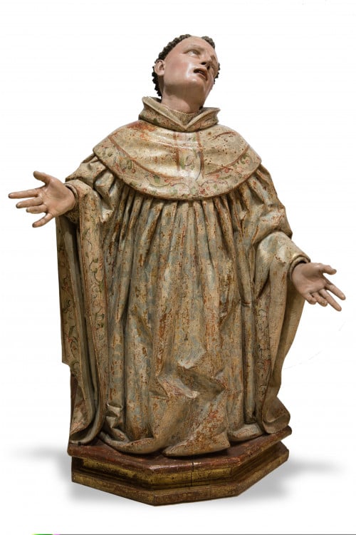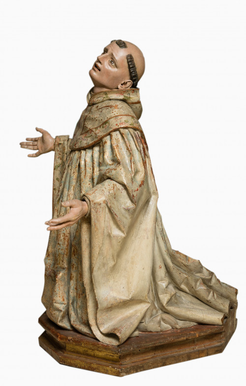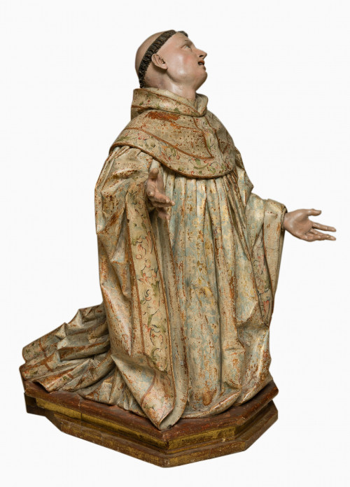 Sus características técnicas y formales permiten atribuirla a Gregorio Fernández, el máximo exponente de la escultura castellana barroca. El autor lo muestra con las manos extendidas en señal de entrega y con gesto de arrobo místico, mostrando el dramatismo contenido que se manifiesta en la mayor parte de sus trabajos. Con la cabeza ligeramente ladeada, dirige su mirada al cielo y tiene la boca entreabierta, mostrando una gran expresividad. El hábito blanco del Císter queda ligeramente matizado por un ligero estofado y una suave policromía de elementos vegetales, mostrando los característicos plegados metálicos que caracterizan sus obras.