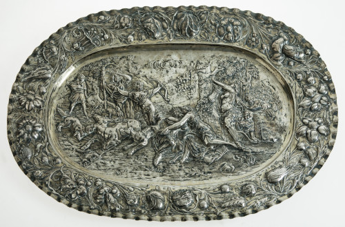 Gran bandeja decorativa en plata, siguiendo modelos antiguos. Escena central en relieve con escena mitológica con Diana y Acteón, y greca de flores y frutos, formando entrelazo, al borde. Marcas sin localizar. Peso: 3.140 gr. Medidas: 88 x 62 cm.