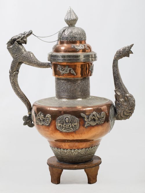 De cobre y metal plateado con decoración de budas y dragones. Faltas