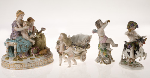 Grupo en porcelana europea, con marcas en la base, representando una escena mitológica con Cupido. Mínima falta.