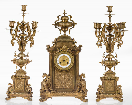 Guarnición compuesta por reloj y pareja de candelabros de metal dorado estilo Napoleón III, ffs.S.XIX - pps.S.XX