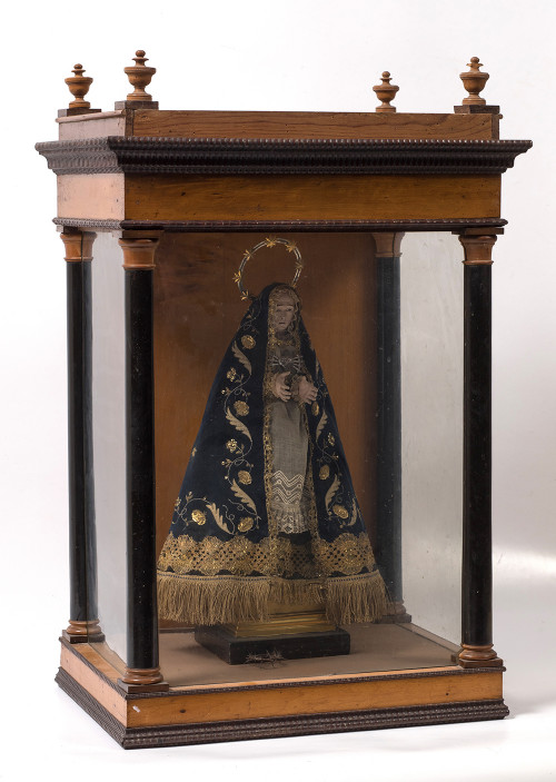"Dolorosa". Escultura vestidera en madera tallada y policromada, con ojos de pasta vítrea. Se presenta en urna de distintas maderas, con faltas. Conjunto: 78 x 51 x 36 cm.