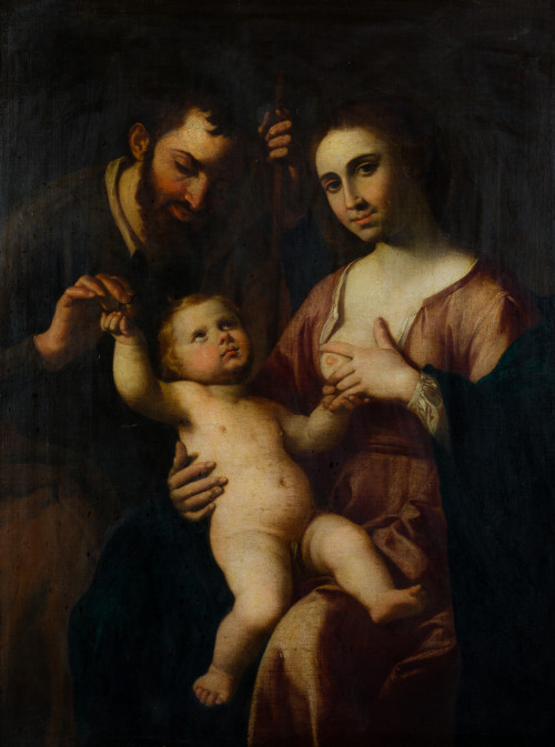 Esta pintura, conservada hasta este momento en una importante colección particular y nunca antes expuesta, reúne todas estas características presentando a los miembros principales de la Sagrada Familia en un espacio indeterminado, en un ambiente de grata cotidianeidad. El Niño Jesús, desnudo y sentado en el regazo de su madre, se encuentra interactuando con la Virgen y san José. Recibe una fruta que le ofrece su padre, mientras que, con su mano derecha, toma la mano que María se lleva a uno de sus senos descubiertos. Con este gesto, Espinosa refuerza el sentido cotidiano, íntimo y familiar de la escena, situándola en un momento previo a la lactancia.