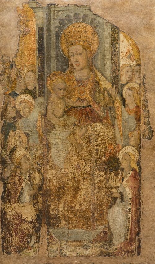 A pesar de sus evidentes daños, esta interesante tabla del siglo XV puede atribuirse al pintor Joan Reixach, uno de los principales impulsores del estilo hispanoflamenco en el Reino de Valencia. Tabla central de un importante retablo descabalado dedicado a la Virgen, el pintor muestra a la imagen titular como en otras obras suyas: entronizada y sujetando al Niño Jesús en su regazo con la mano derecha, mientras que con la izquierda bendice y lleva un jilguero. Rodeada de una nutrida corte celestial, dos ángeles se arrodillan a sus pies ofreciéndole dos jarrones con flores. Su fuerte impronta eyckiana se evidencia en algunos detalles de la obra como en la rica decoración textil y la suntuosidad de los adornos con gemas y perlas.