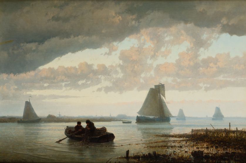 "Paisaje con barca de remos, barcos y ciudad holandesa al fondo"