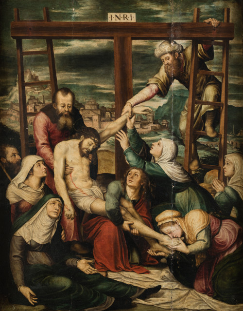 Esta composición del Descendimiento de la Cruz debió de gozar de un gran éxito en su momento. Esto se justifica por la existencia de otra obra semejante de menor tamaño (85 x 65 cm.) que se conserva en el Museo de Bellas Artes de Castellón y que perteneció a la colección del Infante don Sebastián Gabriel (Véase Benito Doménech 2000, pp. 162-163). Sin embargo, la pintura que aquí presentamos tiene el interés añadido de que Juanes, siguiendo la tradición medieval, incluyó en los extremos de la composición los retratos de un hombre y una mujer, como donantes, que sin lugar a duda fueron los comitentes de este importante encargo.