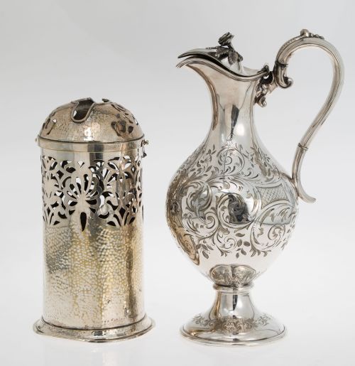 Jarra con tapa en metal plateado inglés. Decoración incisa de rocalla, entrelazos vegetales, volutas de acanto... Asa en voluta.