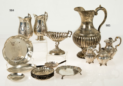 Jarra gallonada y juego de té en miniatura de plata contras