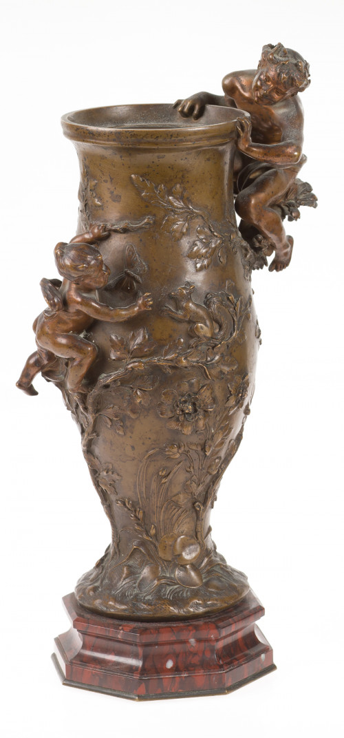 Decoración de niños, flores y animales en relieve. Base octogonal de mármol griotte.