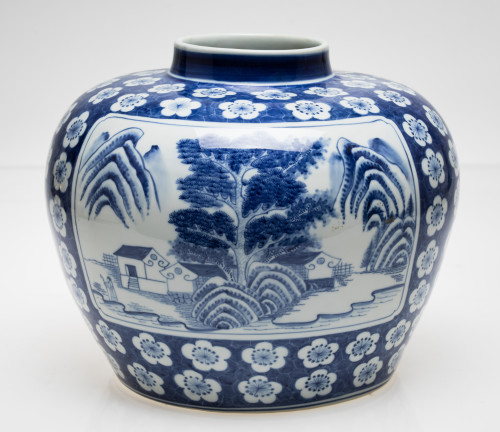 Jarrón de cerámica esmaltada, Tailandia, S. XX. Con decoración de paisajes con casas y vegetación en cartela.