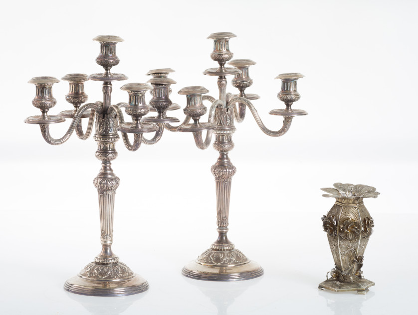 Jarrón de filigrana de plata, pps. S. XX. Con decoración de flores en relieve.
