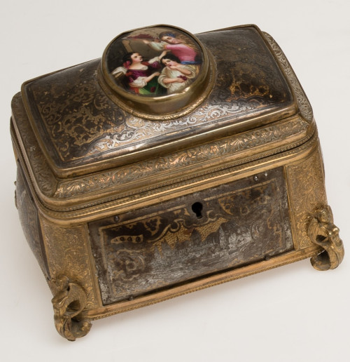 Joyero damasquinado de metal dorado con placa de porcelana en la tapa, Francia, S. XIX.