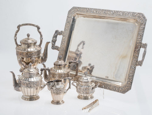 Juego de café y té de plata española Aldao, ley 916. Compuesto por: cafetera, samovar, tetera, lechera, azucarero, pinzas para terrones y bandeja.