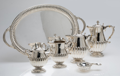 Juego de café y te de plata española Ley 916, S. XX. Compuesto por bandeja ovalada con asas, cafetera, tetera, lechera, azucarero y colador.