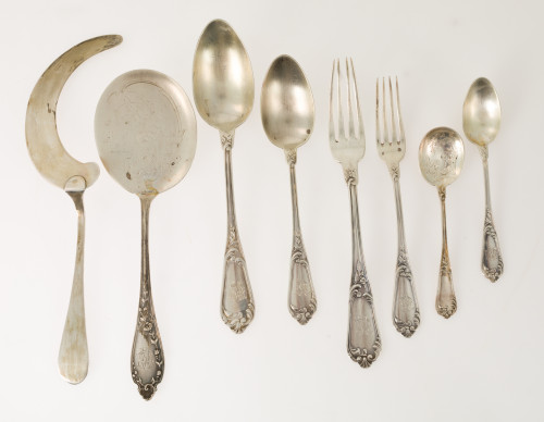 Juego de cubiertos en plata francesa S.XIX-XX, marcas de platero Henri Soufflot. Consta de 4 cucharas de mesa, 4 tenedroes de mesa, 6 cucharas de postre, 5 tenedores de postre, 4 cucharillas, 6 cucharas de helado y dos cubiertos de servir. Decoración vegetal e iniciales grabadas. Peso total: 1.640 gr.