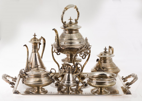 Juego de té en plata francesa s.XIX, con punzones del orfebre Emile Hugo, c. 1850. Decoración con grecas de palmetas y remates en las asas en mascarones y rocalla. Consta de bandeja con asas laterales, tetera cafetera, boulloire azucarero, lechera y bowl para dulces Con iniciales grabadas.